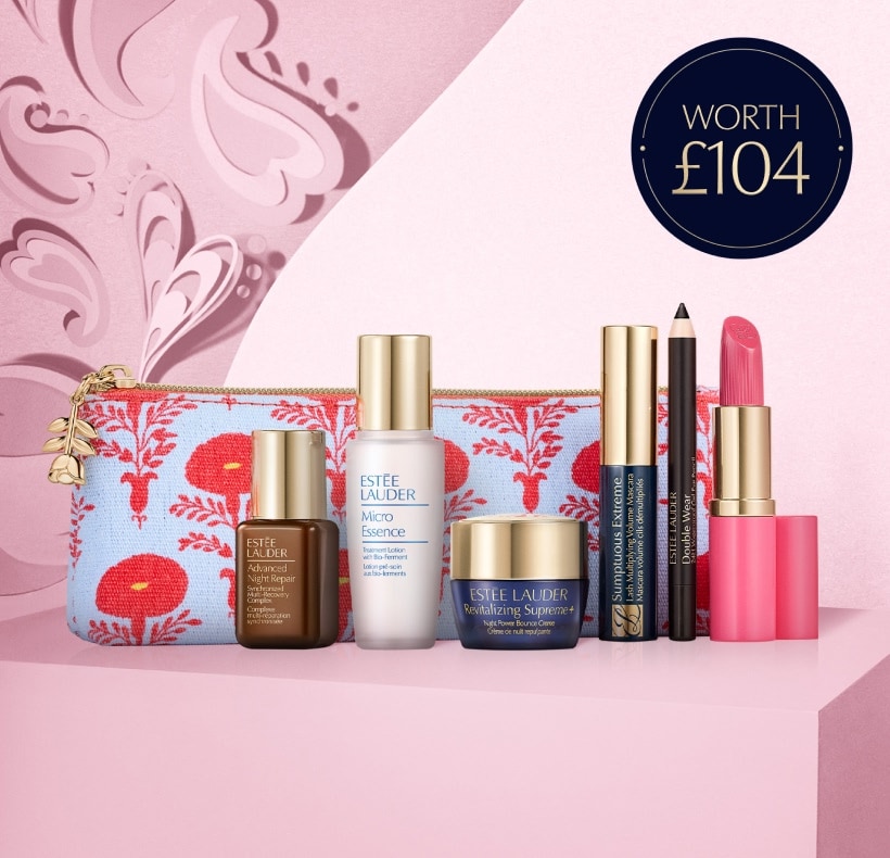 1Offer is available exclusively at esteelauder.co.uk until 11.59pm on 15/02/2026 or while stock lasts. Offer is for a free 6-piece gift when you spend £80+. Gift contains an Advanced Night Repair Synchronized Multi Recovery Complex II (15ml), a Revitalizing Supreme+ Night Power Bounce Creme (7ml), a Micro Essence Treatment Lotion (15ml), a Pure Color Lipstick in shade 260 Eccentric (3.5g), a Double Wear 24-H Waterproof Eyeliner Pencil in shade Onyx (0.8g), a Sumptuous Extreme Lash Multiplying Volume Mascara (2.8ml), and a Cosmetics Bag. When you spend £100+ you will also receive a full size Advanced Night Cleansing Balm Cleanser with Lipid-Rich Oil Infusion (70ml). Offer is automatically applied at checkout. Offer is limited to one use per customer. Purchase requirement excludes gift cards, gift sets, custom gifts, and pre-discounted products. Offer not valid in conjunction with any other promotional offer including Estée E-List Loyalty Program tier benefits.